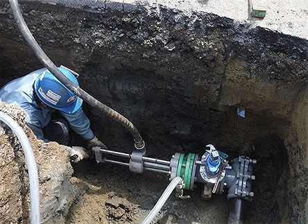 | 給水工事(一式) 開発工事などの配水管布設や 既設水道本管から宅地への給水管引き込みなど 自社施工でおこないます。 |
